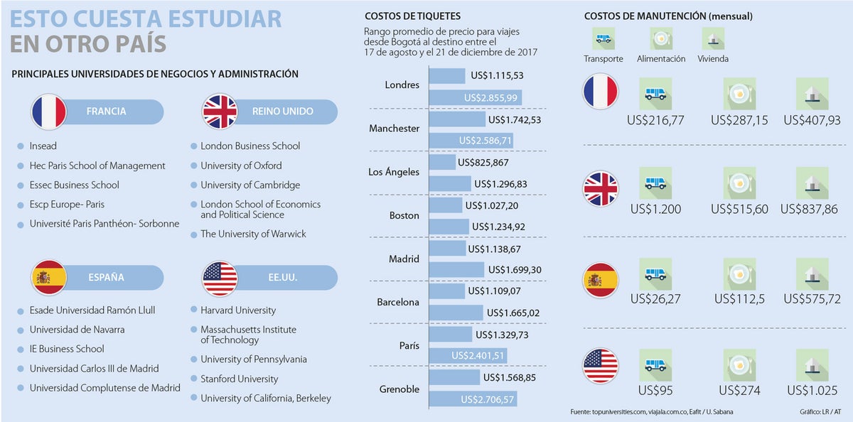 Según datos obtenidos por LR usted debe destinar, en promedio, US$9.254 para seis meses de un intercambio. Esos costos incluyen el valor de vivienda, transporte y alimentación en países como Estados Unidos., España, Reino Unido y Francia (ver gráfico), sin contar los gastos ocasionales que se requieran para las clases.
