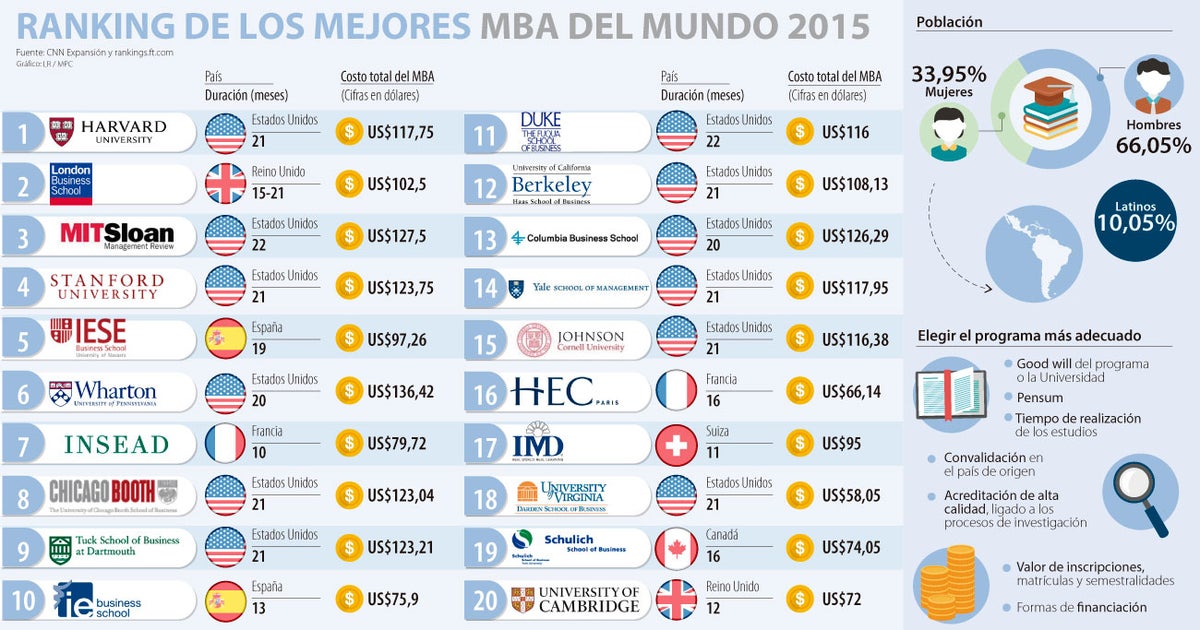 Según el Global MBA Ranking 2015, la Universidad de Harvard ocupa el primer lugar, seguido de la Escuela de Negocios de Londres, y el top tres lo cierra la Escuela de Negocios Wharton de la Universidad de Pensilvania. Por otro lado, y de acuerdo al último informe anual elaborado por The Economist, ocho de los mejores 10 MBA en el mundo están en Estados Unidos. En el primer lugar se ubica Booth School of Business de la Universidad de Chicago por la calidad de sus clases y profesores, además porque 98% de sus alumnos encuentran trabajo dentro de los tres meses posteriores a su graduación.