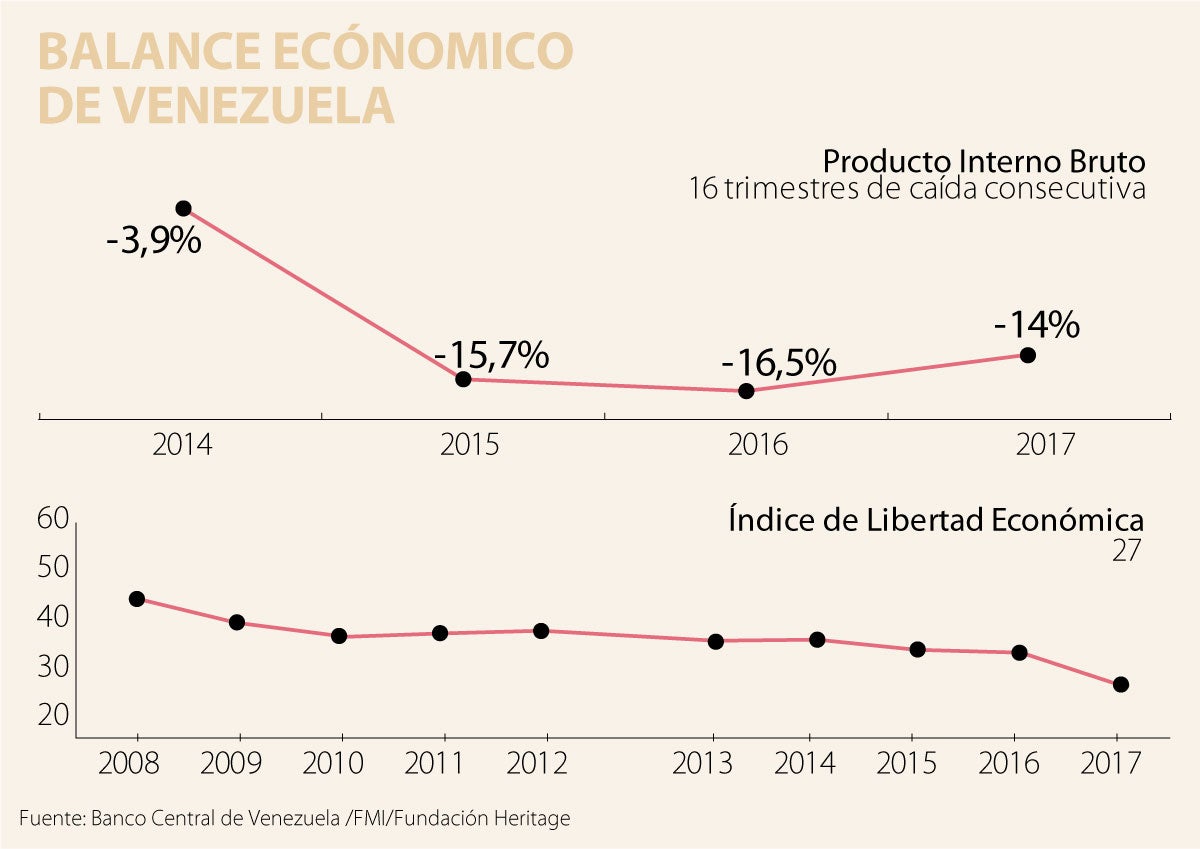 Este descalabro de la industria petrolera en cabeza de la estatal Pdvsa ha arrastrado a la economía, hundiéndola en una profunda recesión, en la que se combina una caída del crecimiento del PIB de 15% en 2017 con una hiperinflación sin par en el hemisferio de 2.616% (¡!), según el FMI, el único país en el mundo con inflación de cuatro dígitos. Se estima que Venezuela ha perdido 40% de su PIB en los últimos cuatro años, durante los cuales se ha venido destruyendo su aparato productivo.