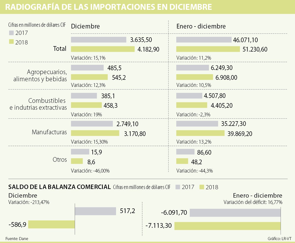 Déficit de la balanza comercial aumentó 16,8% en 2018 y llegó a US$7.113,3 millones