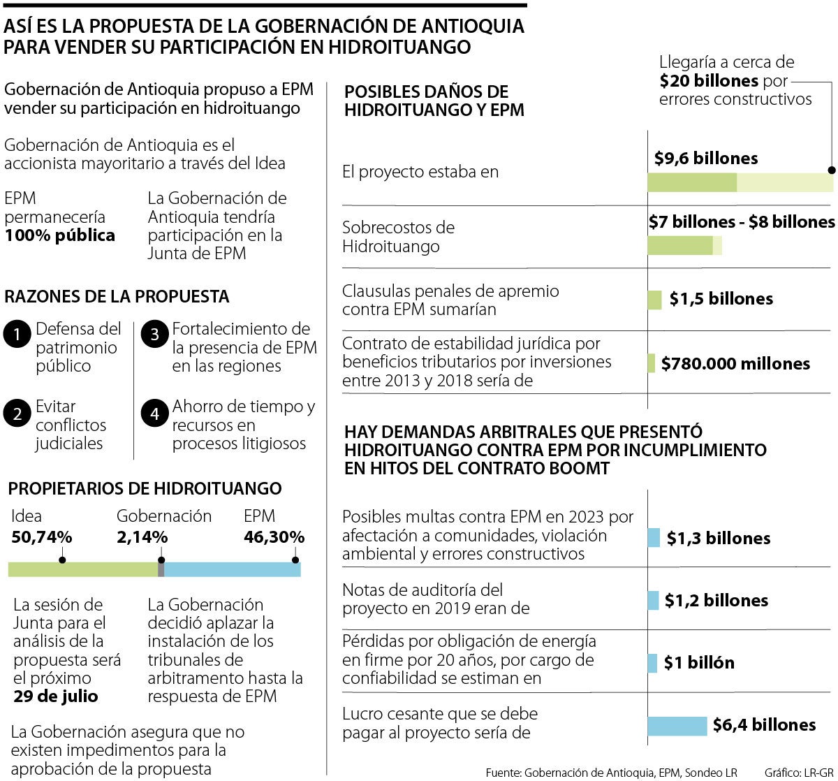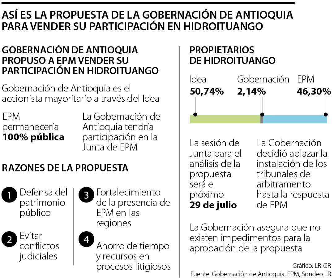 La Gobernación de Antioquia, accionista mayoritario por medio del Idea de Hidroituango, que tiene 52,88% del proyecto, le propuso a Empresas Públicas de Medellín (EPM) venderle su participación en la hidroeléctrica a cambio de una parte de la compañía de servicios públicos de la capital antioqueña. El negocio se analizará y discutirá en la Junta Directiva de EPM antes de fin de mes.