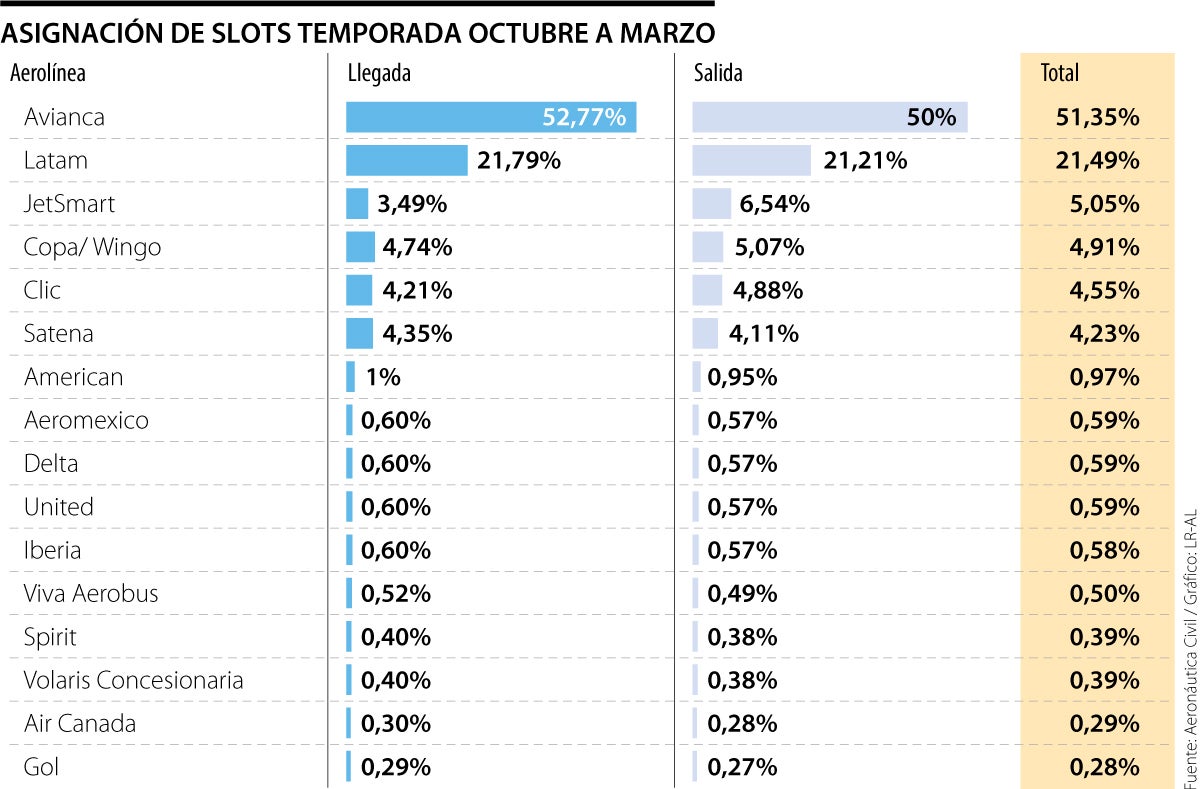 De acuerdo con la información suministrada por la Aerocivil, Avianca es la que más se quedó con slots para la temporada Winter 2023, con 51,35% del total de los turnos en el aeropuerto El Dorado, divididos en 52,77% en llegadas y 50% en salidas.