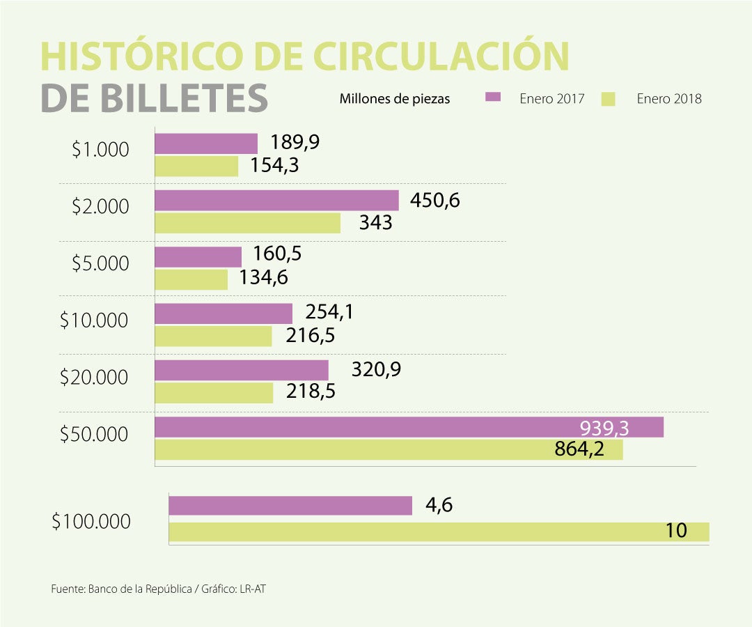Para fortalecer la seguridad de los billetes, los bancos centrales los actualizan cada 12 o 15 años. El Banco de la República, desde 2016, inició la circulación de nuevos billetes que tienen como protagonistas a la pintora Débora Arango ($2.000), al poeta José Asunción Silva ($5.000), a la antropóloga Virginia Gutiérrez ($10.000), al expresidente Alfonso López Michelsen ($20.000), al escritor Gabriel García Márquez ($50.000) y al expresidente Carlos Lleras Restrepo ($100.000).