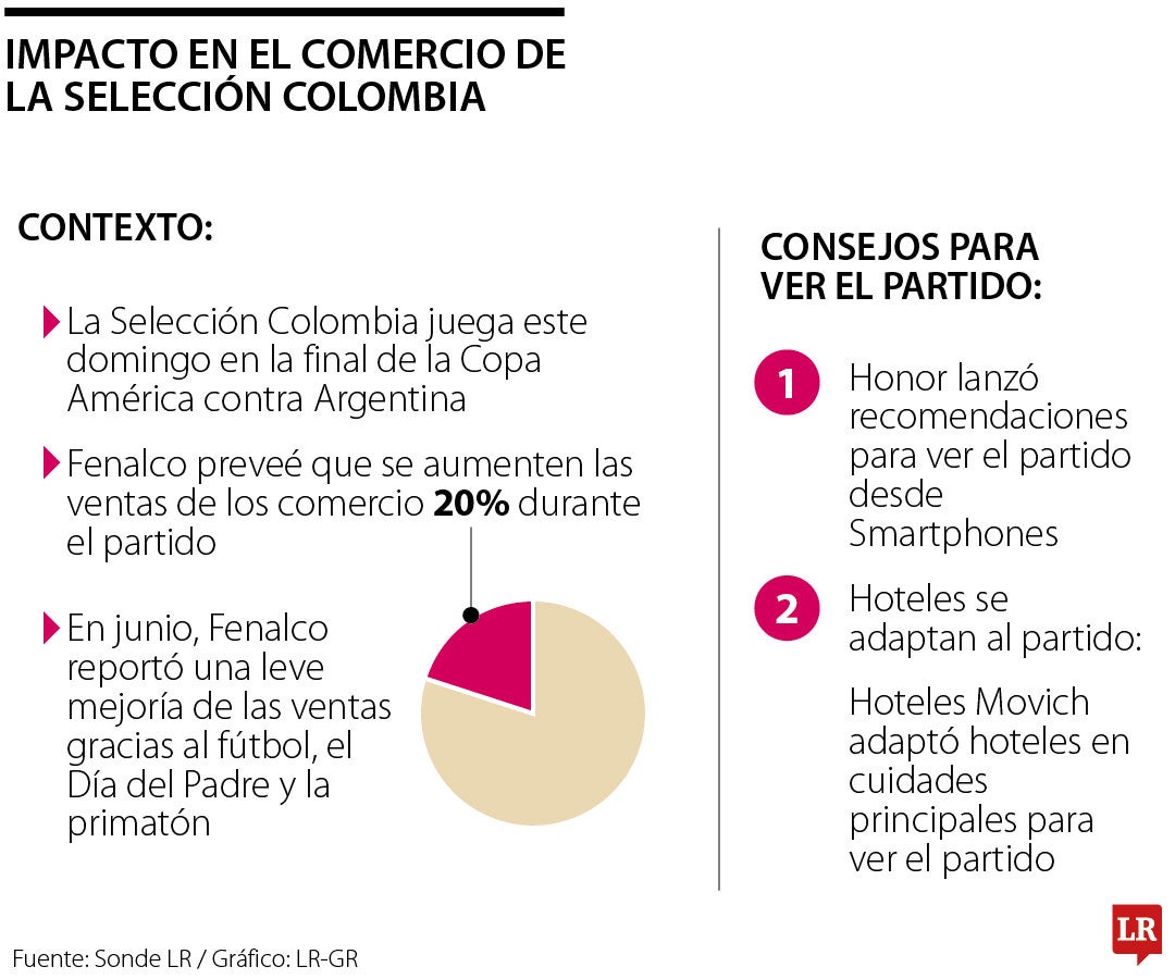 Uno de los eventos deportivos más importantes para Colombia ocurrirá mañana cuando la Selección se enfrente contra Argentina por el título de la Copa América. Esto, además de causar euforia en la comunidad, genera aumento de ventas, ya que, según la Federación Nacional de Comerciantes, Fenalco, se espera que las ventas de los comercios aumenten 20% durante el fin de semana futbolero.