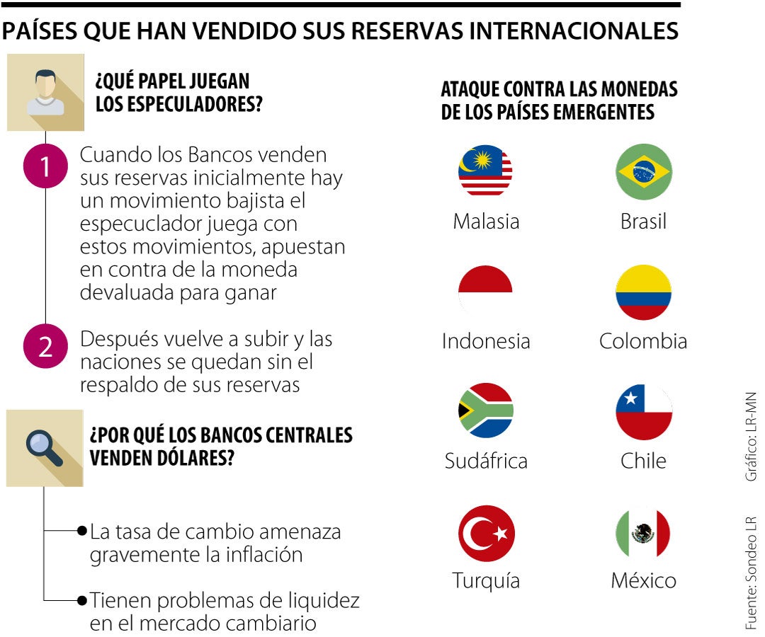 Cuando la moneda se empieza a devaluar, algunas naciones optan por vender las reservas internacionales con el objetivo de defenderla. Es entonces que los especuladores fichan al país y compran los dólares, en una maniobra con la idea de que el banco central no será capaz de aguantar. “Es una apuesta que los bancos centrales pierden porque no tienen la caja o el músculo para detener el flujo internacional; inicialmente hay un movimiento bajista y después vuelve y sube”, aseguró Andrés Moreno