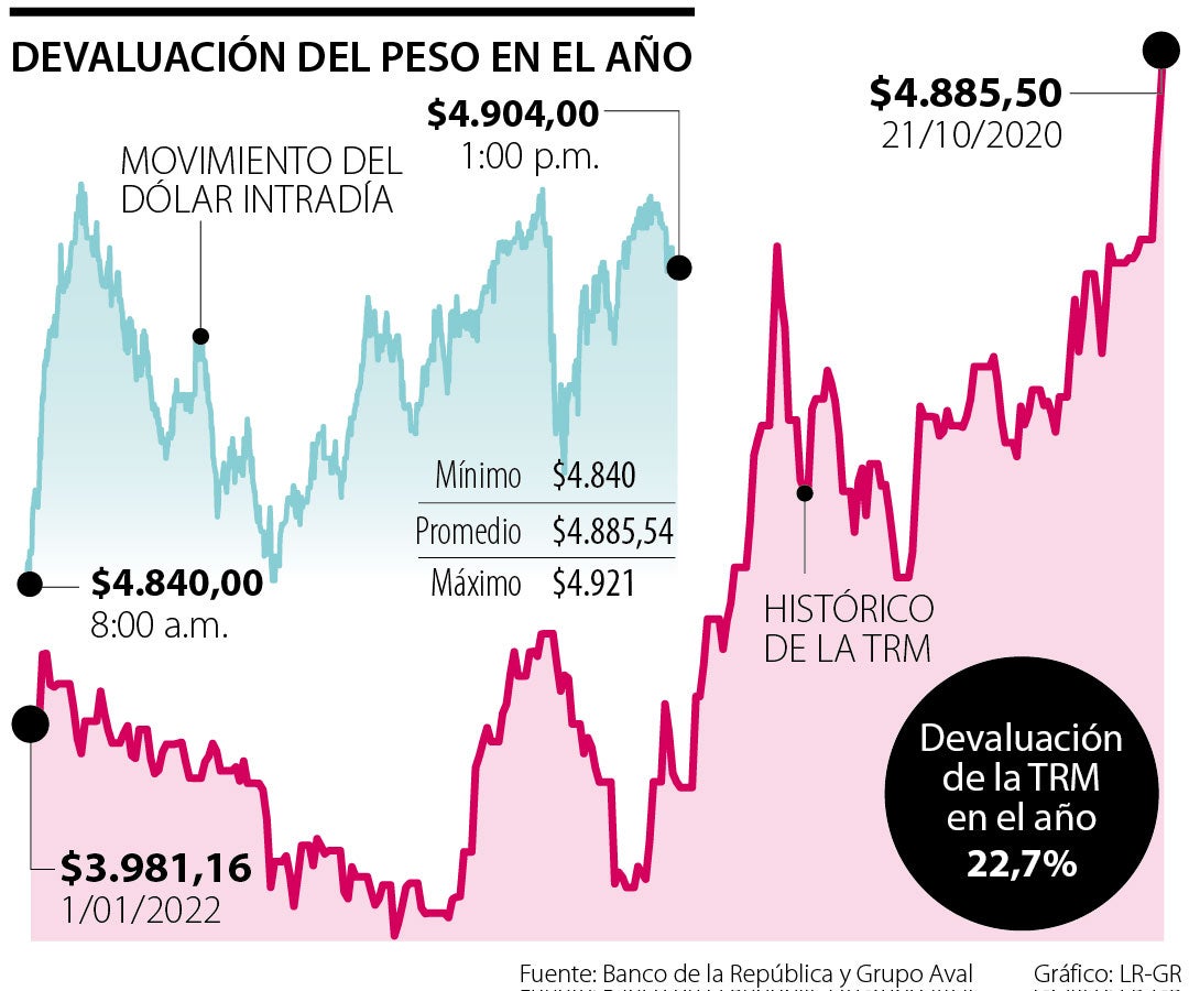 Desde enero, la Tasa Representativa del Mercado (TRM) ha subido $904, pasando de $3.981,16 a $4.885,50 según la tasa vigente hoy. Eso implica una devaluación cercana 22,7% este año.