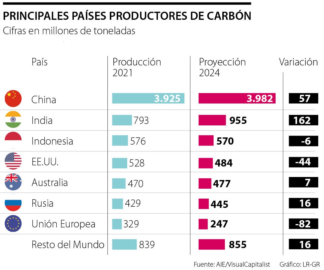 Según el más reciente informe de la Agencia Internacional de la Energía (AIE), recogido por Visual Capitalist, los principales países productores de carbón son China, con 3.925 millones de toneladas; seguido de India, con 797 millones de toneladas; Indonesia, con 576 millones y Estados Unidos, con 528 millones.