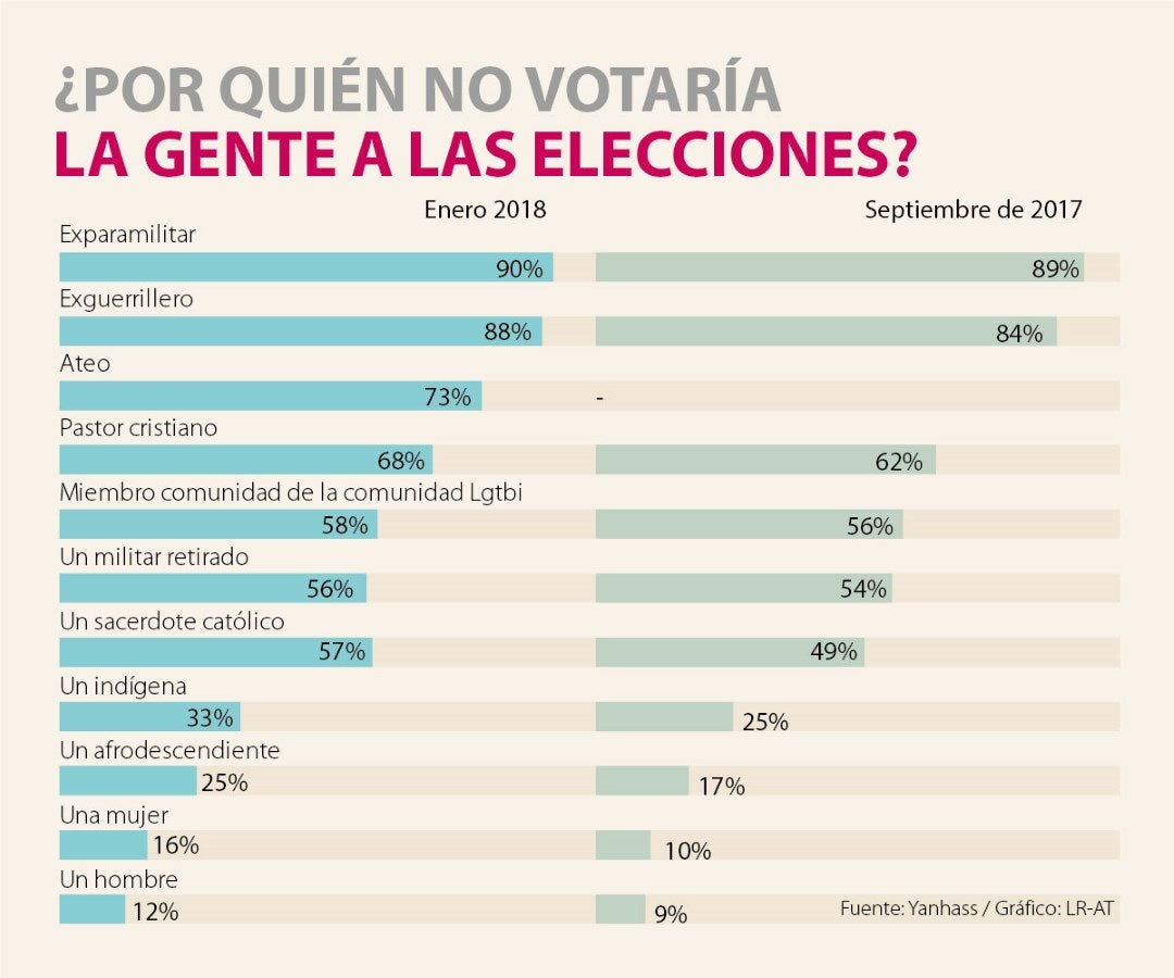 Los avances en materia de paz en Colombia han sido evidentes. En los últimos años, el país pasó por varios procesos que sacaron del conflicto armado a las Autodefensas Unidas de Colombia (AUC) y a la guerrilla de las Farc más recientemente; sin embargo, los colombianos, en su gran mayoría, no estarían dispuestos a votar quienes fueron miembros de estas organizaciones en una contienda a la Presidencia de la República, de acuerdo con la más reciente Gran Encuesta, hecha por YanHaas para la gran alianza de medios.