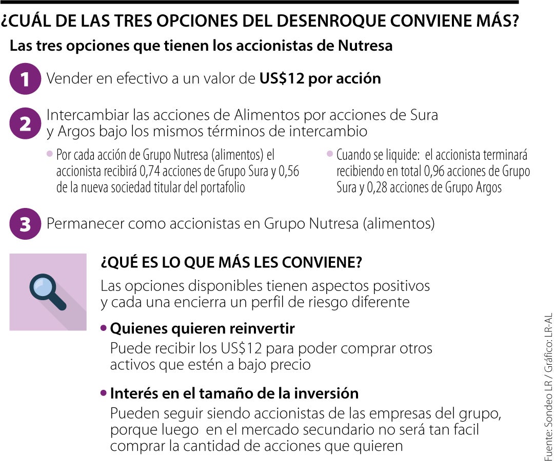 La primera opción tiene que ver con vender en efectivo a un precio de US$12 la acción; la segunda es intercambiar las acciones de Alimentos por acciones de Grupo Sura y Grupo Argos bajo los mismos términos de intercambio, y por último, la tercera le permite a los accionistas minoritarios mantener sus acciones en Nutresa.