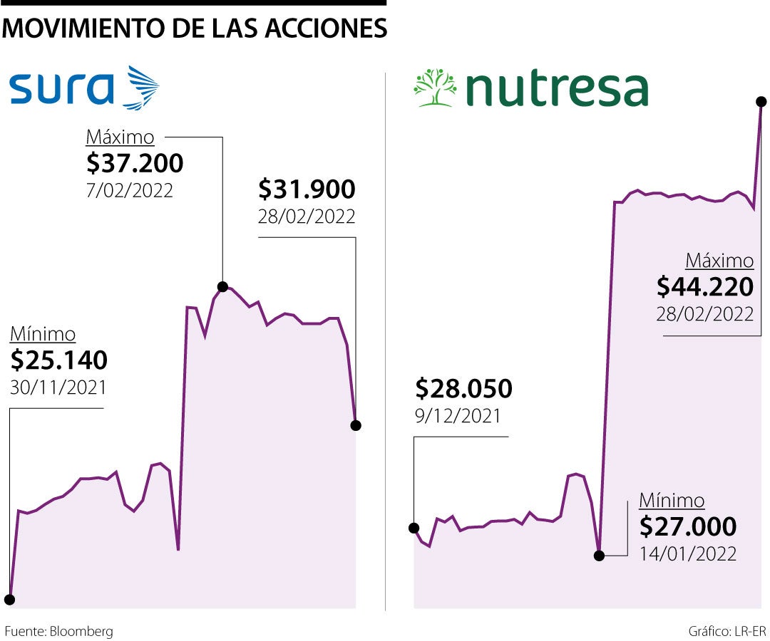 Durante su último día de negociación el pasado 28 de febrero, cuando el órgano regulador ordenó congelar las especies, las acciones de Nutresa crecieron 10% hasta los $44.220, mientras que Sura presentó un leve descenso hasta los $31.900. Una vez regresen al ruedo, se prevé un fuerte repunte, como ha ocurrido en las ofertas pasadas.