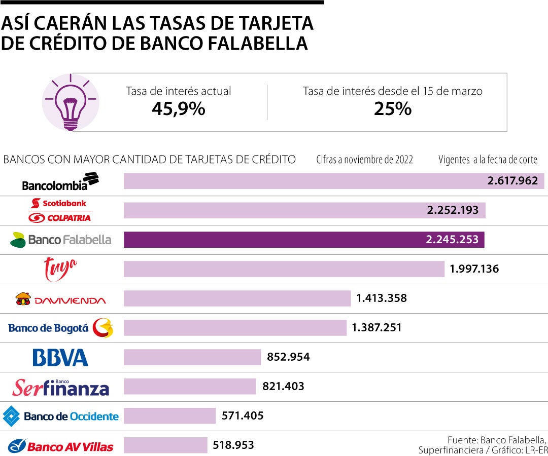 El Banco Falabella se convirtió en la octava entidad financiera en anunciar una reducción en las tasas de interés de sus tarjetas de crédito, luego de que Bancolombia iniciara un aluvión de medidas similares en medio de una tasa de usura histórica y un nivel de inflación que no se veía desde 1999.