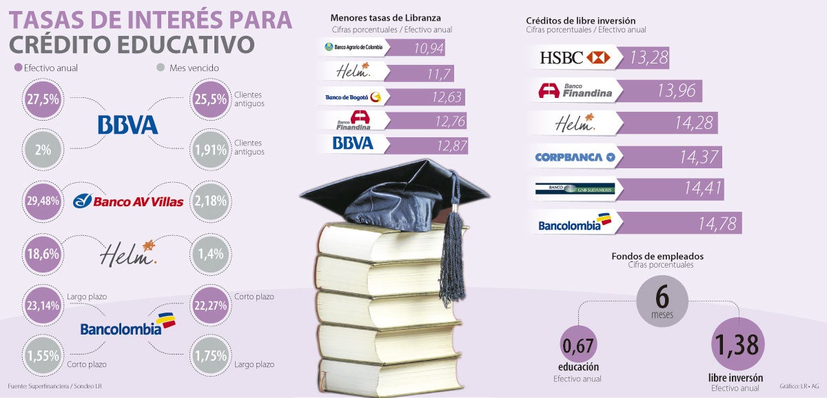 Los fondos de empleados de las empresas también ofrecen financiamiento de estudio. Según un sondeo LR las tasas de interés van desde 0,67% a seis meses y de libre inversión con una tasa de 1.38% efectivo anual.