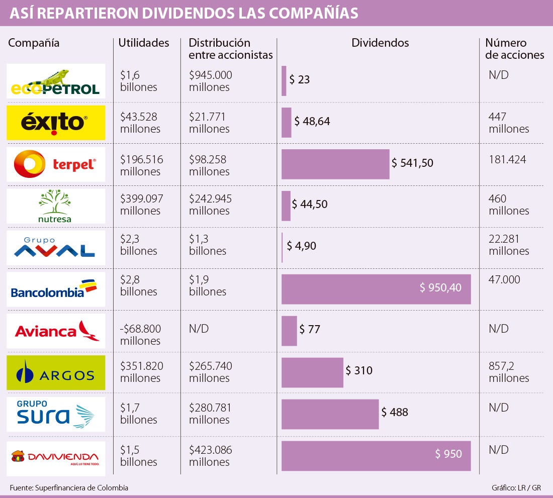 Al sexto y séptimo lugar se clasifican Avianca Holdings con $77 y Grupo Éxito con $48,64. Más atrás, está Nutresa a $44,50 y con buenas cifras en el total de lo que entregará en la cifra de utilidades a repartir está Ecopetrol a $23. Este papel dividirá $945.000 millones.