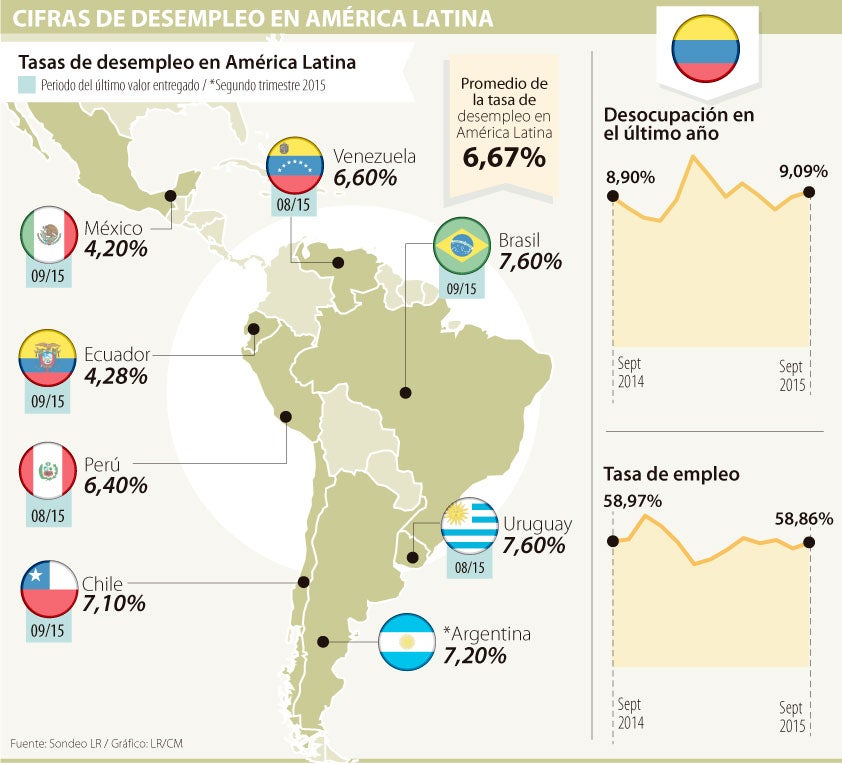 En la región, la desocupación promedio es de 6,6% y, Colombia, que había sido hasta hace poco, uno de los jalonadores de crecimiento y desarrollo de los países latinoamericanos, ahora presenta la peor perspectiva en la materia con la tasa más alta de desempleo (9,09%).