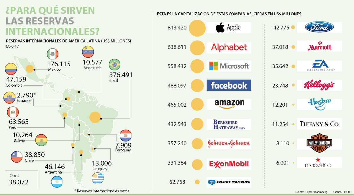 El valor total de las reservas internacionales de América Latina, ascendió a US$830.944 millones en mayo, según datos proporcionados por la Comisión Económica para América Latina y el Caribe (Cepal). Teniendo en cuenta este panorama, y que las reservas de Venezuela han ido disminuyendo significativamente en lo que va del año (US$9.942 millones), LR averiguó su valor para presentar la magnitud de estas. Con esta cifra total en mente, las reservas de Latinoamérica superan la capitalización bursátil de Apple, que el viernes pasado llegó a US$813.420 millones.