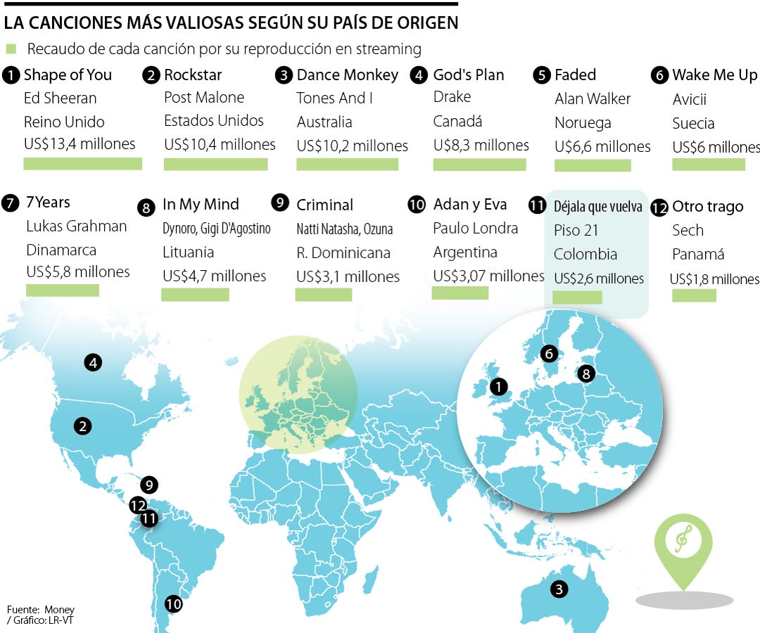 A esta conclusión llegó S Money, que cruzó los datos de Spotify (número de reproducciones de canciones), y Kworb (para saber el recaudo de ellas); y así encontró los 20 temas con mejores ganancias globales para sus autores o intérpretes, en una tabla que tiene a Colombia en el puesto 11 gracias al trabajo de Piso 21. (Ver gráfico)