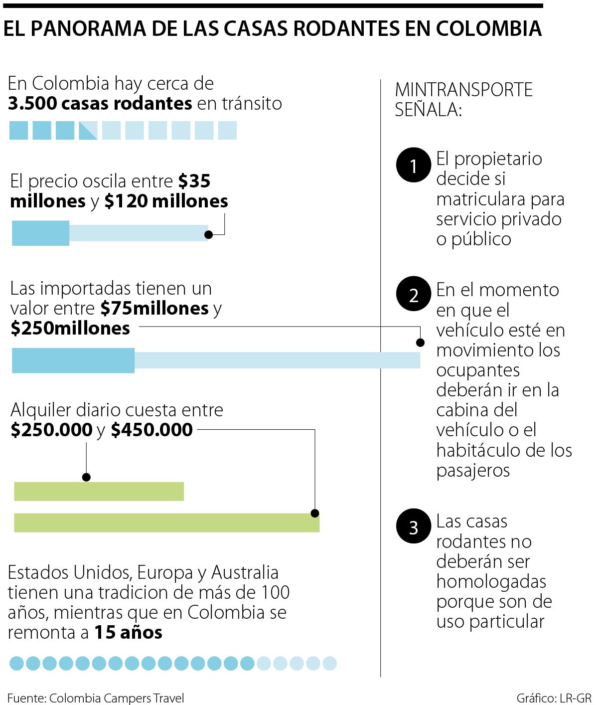 “La cultura en Estados Unidos, Europa y Australia en torno a las casas rodantes tiene más de 100 años, mientras que en Colombia tenemos uno 15. Los destinos más frecuentados son el Eje Cafetero, la costa, Boyacá y los Llanos. La recomendación es disfrutarlas y el viaje”, agregó Vargas.