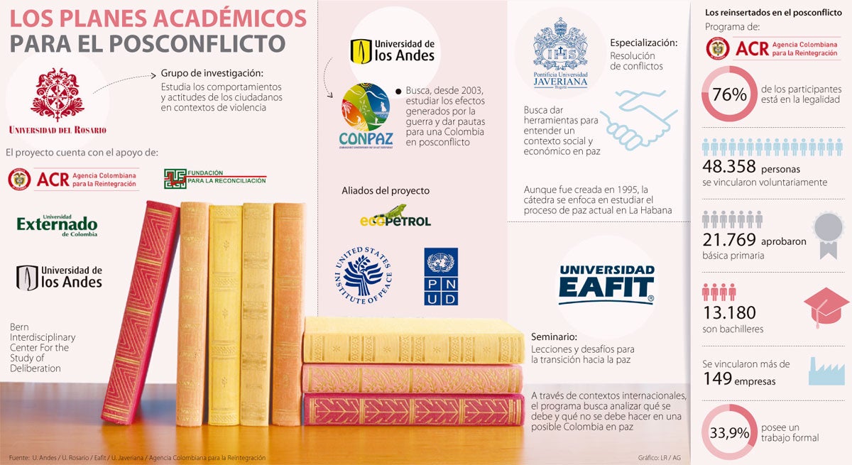 De un lado está la Universidad de Los Andes, que bajo un programa que combina el análisis académico y el apoyo solidario de algunos de sus miembros, viene dando a conocer desde 2003 propuestas y escenarios que Colombia debería afrontar ante un posible escenario de paz. La iniciativa va de la mano con el Programa de las Naciones Unidas para el Desarrollo, Ecopetrol y el Institute of Peace de Estados Unidos.